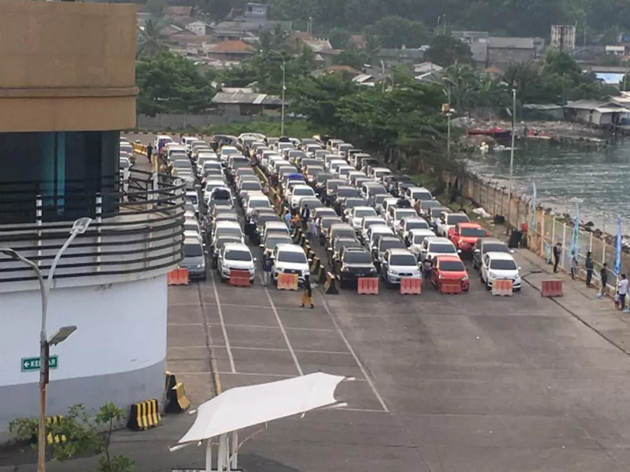 Berbagai jenis kendaraan antre masuk kapal di Pelabuhan Merak, Banten. (Foto: Siti Dewi Yanti/ RBG.id)