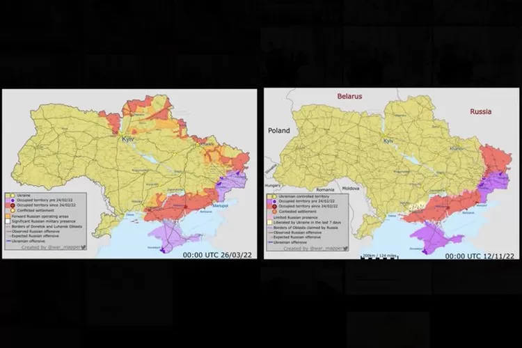 Dia membagikan peta tersebut ke Twitter pada hari Sabtu (12/11). Dan membandingkan dua peta Ukraina selama perang.