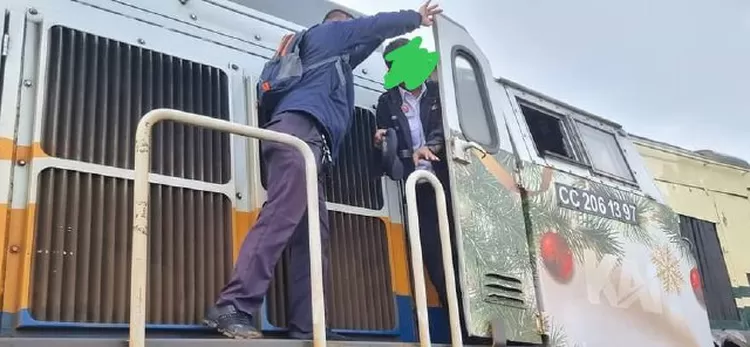 Sang masinis Kereta Api Turangga keluar dari gerbong depan dibantu oleh petugas kereta api yang datang ke lokasi dari pintu samping.