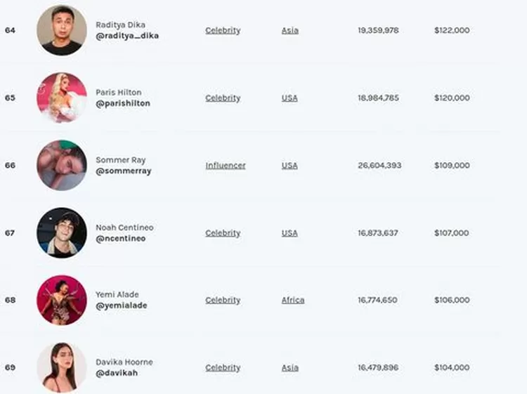 Dengan tarif posting mencapai $122.000. Di bawah Raditya Dika ada Paris Hilton yang berada di urutan ke-65 dengan tarif per posting sebesar $120.000.