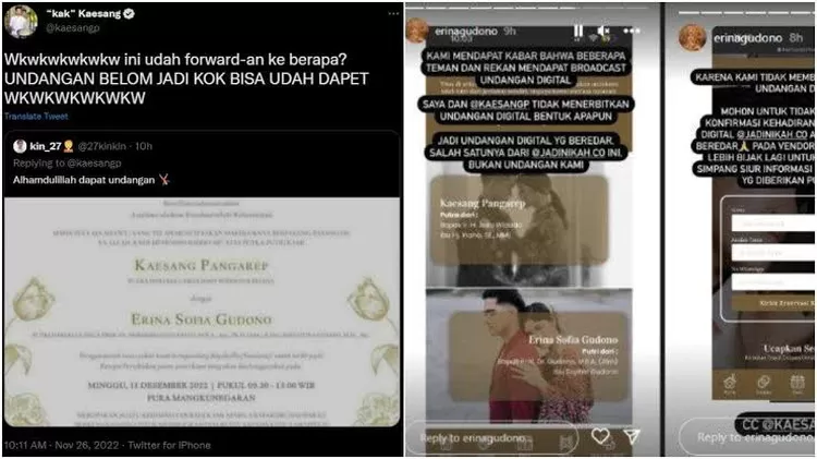 Melalui akun Twitter pribadinya, Kaesang Pangarep memberikan tanggapan atas beredarnya foto undangan pernikahannya. Dia kebingungan undangan sudah beredar di media sosial. Kaesang mengklaim undangan pernikahan belum tuntas dibuat.