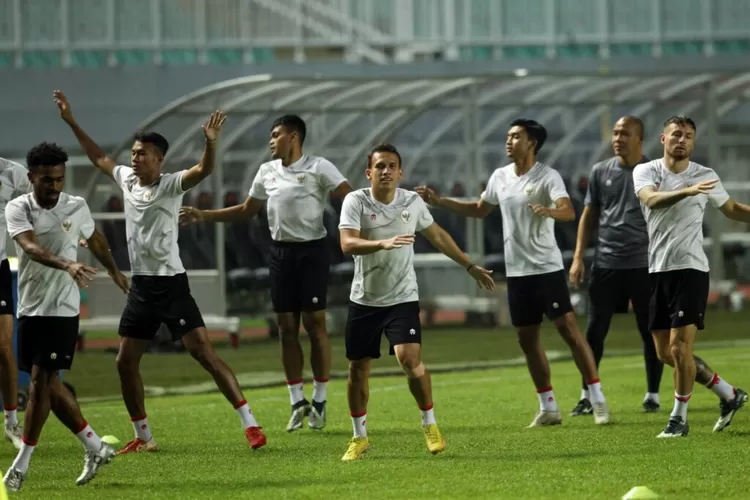 Pesepak bola Timnas Indonesia Egy Maulana (tengah) mengikuti sesi latihan jelang laga ke 2 FIFA match day melawan Curacao distadion Pakansari, Cibinong, Bogor, Jawa Barat, Senin (26/9/2022). (Foto: HARITSAH ALMUDATSIR/JAWA POS)