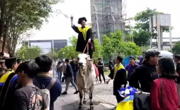Seperti yang terlihat pada unggahan video TikTok milik akun @ad4181mo yang kini viral di media sosial. Dalam video yang diberi judul “wisuda bawa mobil x, wisuda bawa sapi” terlihat seorang mahasiswa yang memakai seragam wisuda lengkap dengan topi toga yang menutupi kepalanya menunggangi seekor sapi.